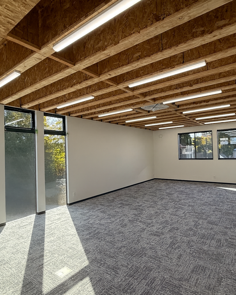 天井を隠さない開放的な構成と、木目の温かみが視覚的にも心地よく、鉄骨造では表現しづらい木造ならではの魅力が詰まった事務所空間となりました。