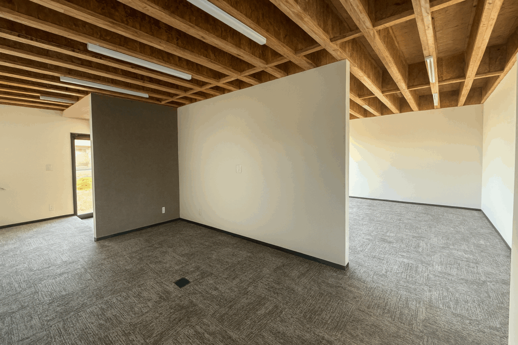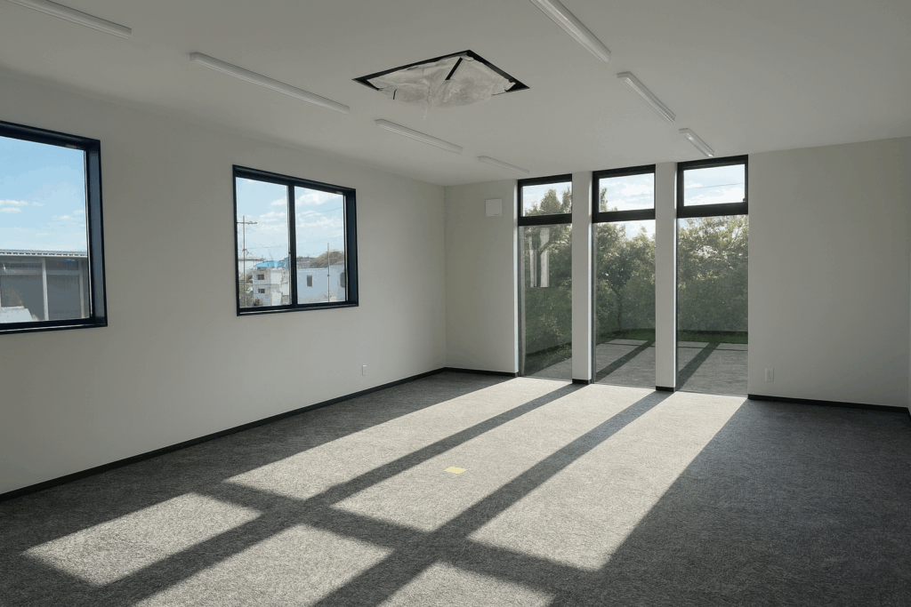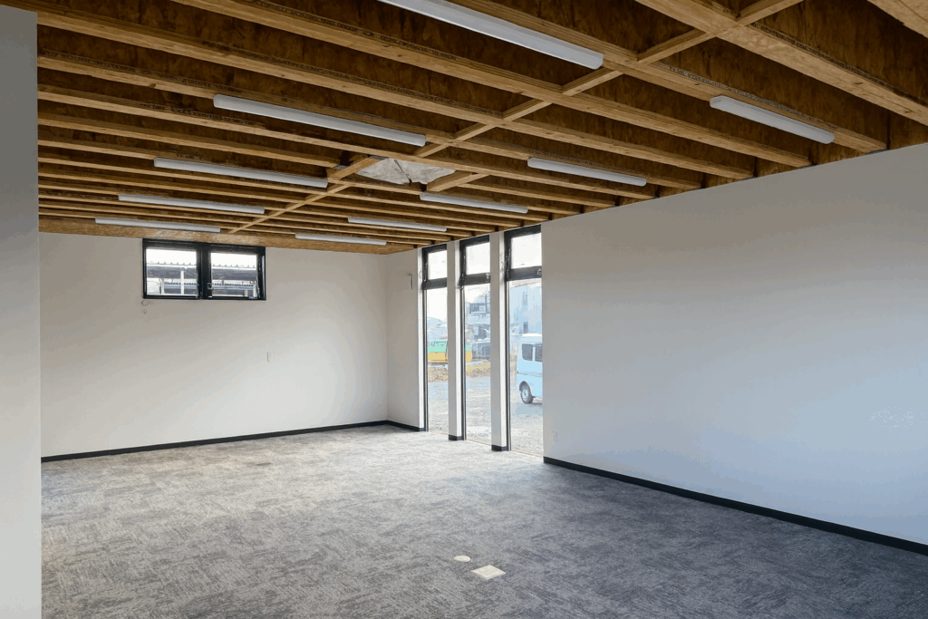 当初は2階会議室でご検討いただいていましたが、最終的には「日常的に社員が長く滞在する1階事務所こそ現しの良さが活きる」という理由で、1階のみ現し天井を採用することとなりました。